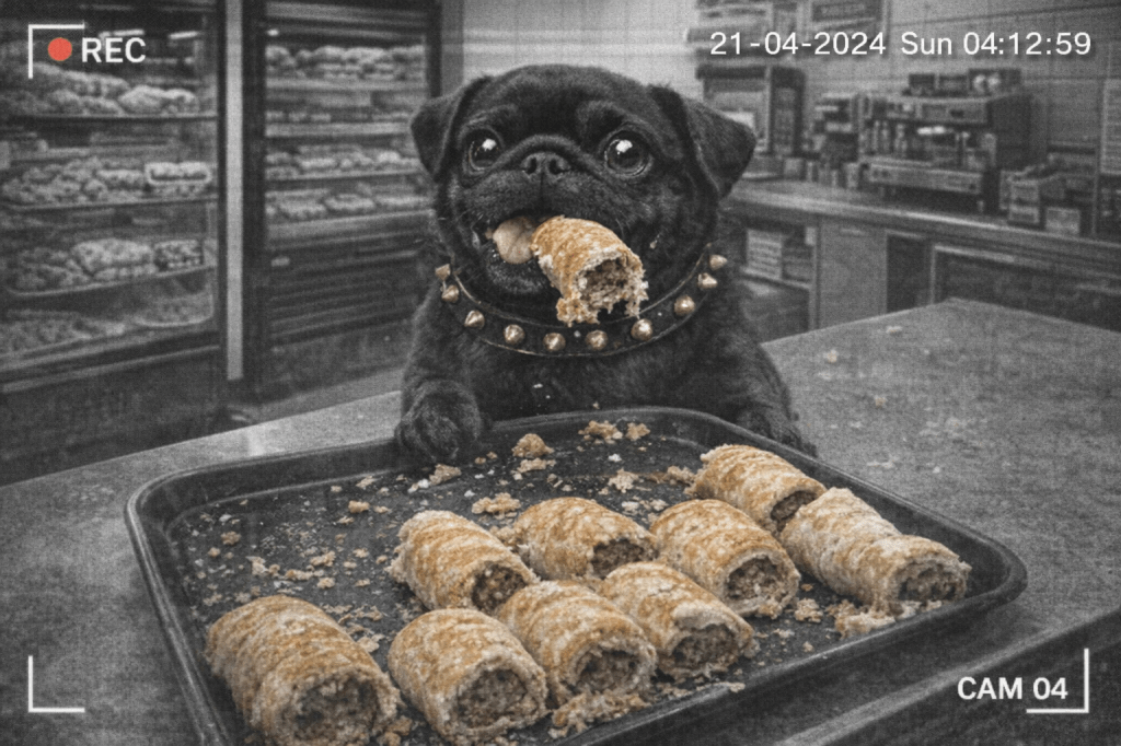 Jones’ Bakery have release a shocking image of a recent incident where a small Black Pug raided it’s shop on the High Street and proceeded to eat all the sausage rolls and the tray they were served on.