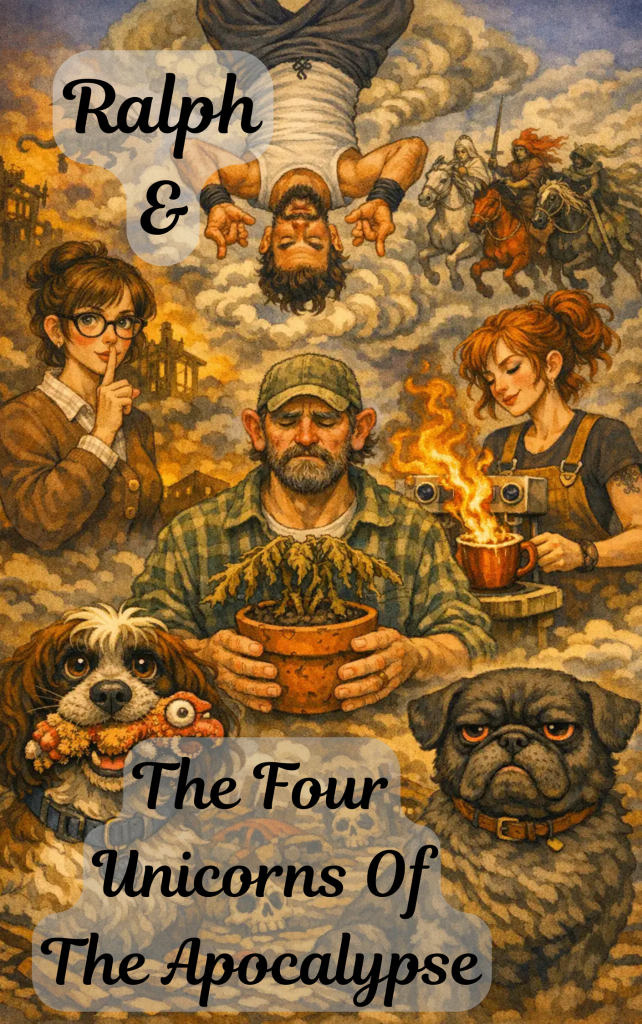 Famine, who was sipping his cider like a man trying to negotiate with it, added, “Besides, we’re supposed to be discussing the apocalypse schedule.”